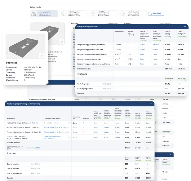 Gain complete control over your pricing with precision time-based cost adjustments for each manufacturing operation and line item. Our granular pricing tools let you fine-tune operation times, machine rates, labor costs, and setup parameters to ensure accurate quotes that protect your margins while staying competitive.